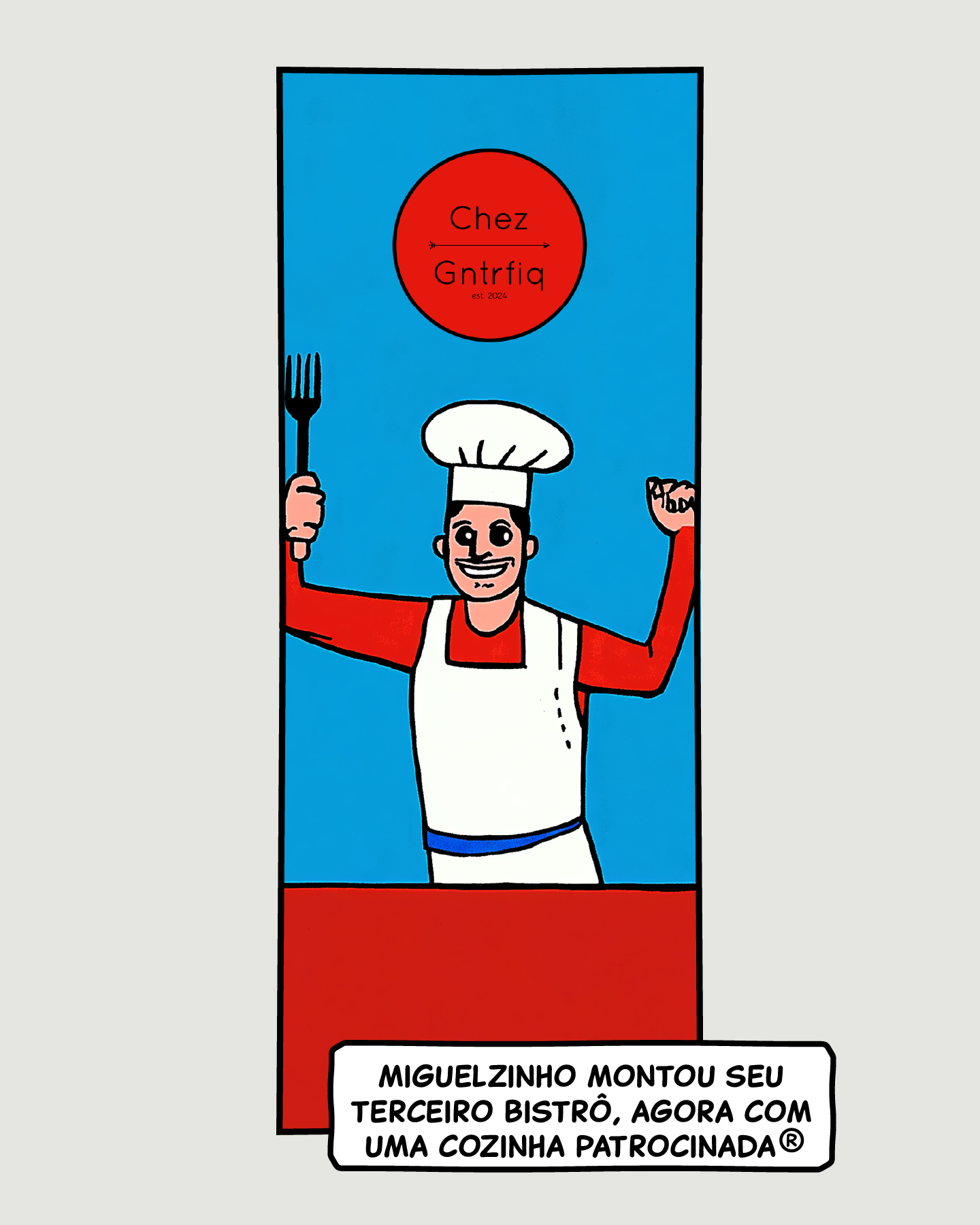 2. Miguelzinho: Chef de braços abertos em frente ao seu bistrô "Chez Gntrfiq". Texto: "MIGUELZINHO MONTOU SEU TERCEIRO BISTRÔ, AGORA COM UMA COZINHA PATROCINADA®"