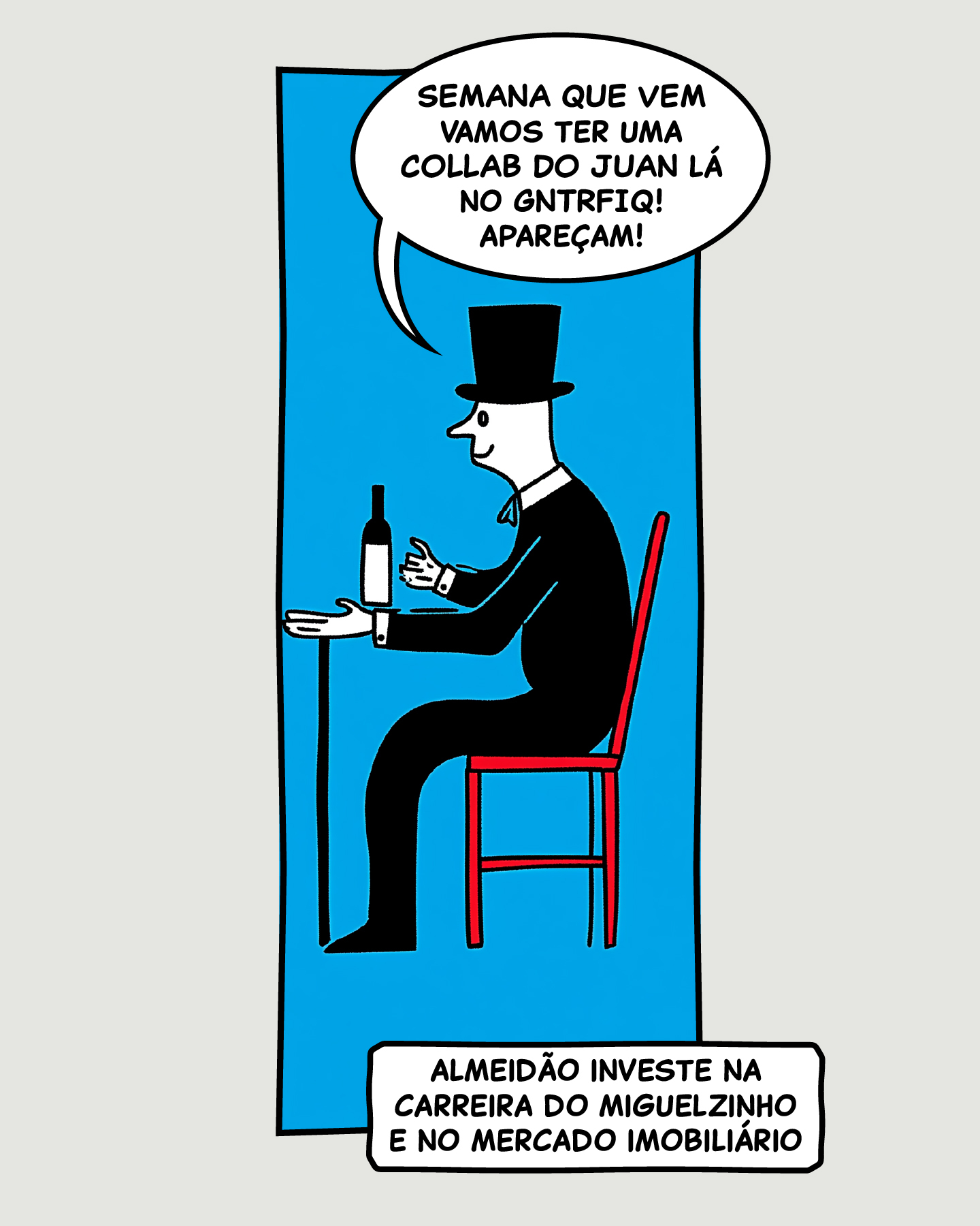 3. Almeidão: Investidor rico de cartola sentado à mesa. Texto: "SEMANA QUE VEM VAMOS TER UMA COLLAB DO JUAN LÁ NO GNTRFIQ! APAREÇAM!". Legenda: "ALMEIDÃO INVESTE NA CARREIRA DO MIGUELZINHO E NO MERCADO IMOBILIÁRIO"