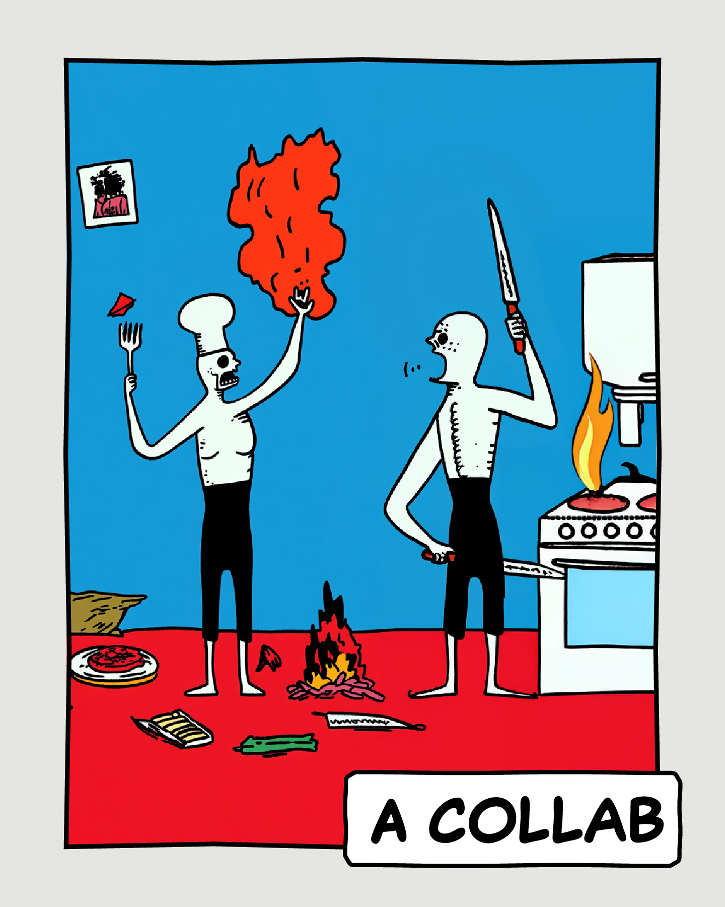 4. A Collab: A cozinha pegando fogo, com Juan e Miguelzinho transformados em esqueletos/zumbis estressados, facas voando e comida queimada. Título: "A COLLAB".