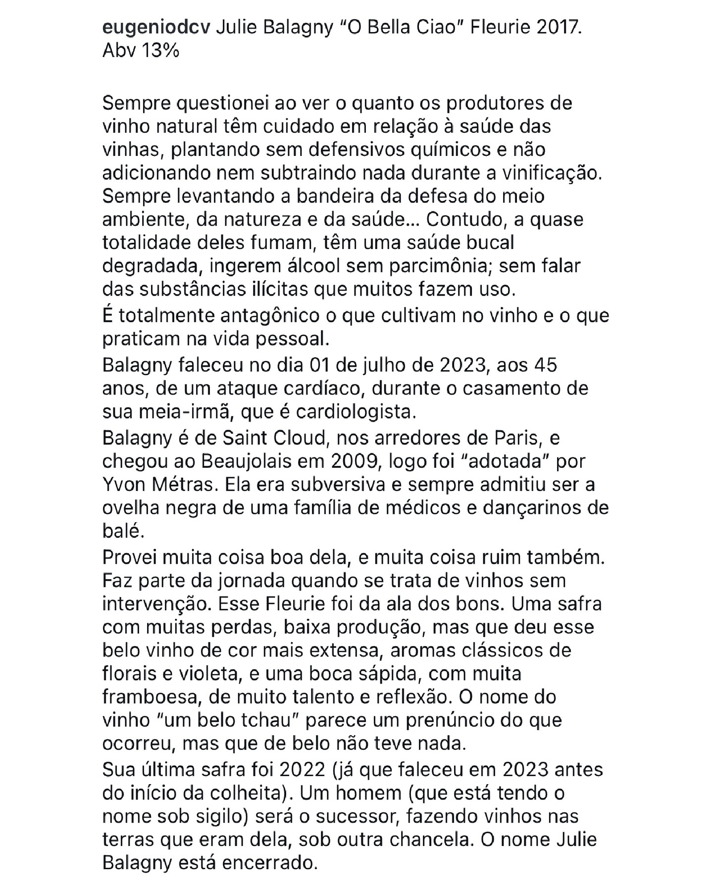 "Sempre questionei ao ver o quanto os produtores de vinho natural têm cuidado em relação à saúde das vinhas, plantando sem defensivos químicos e não adicionando nem subtraindo nada durante a vinificação. Sempre levantando a bandeira da defesa do meio ambiente, da natureza e da saúde... Contudo, a quase totalidade deles fumam, têm uma saúde bucal degradada, ingerem álcool sem parcimônia; sem falar das substâncias ilícitas que muitos fazem uso. É totalmente antagônico o que cultivam no vinho e o que praticam na vida pessoal. Balagny faleceu no dia 01 de julho de 2023, aos 45 anos, de um ataque cardíaco, durante o casamento de sua meia-irmã, que é cardiologista. Balagny é de Saint Cloud, nos arredores de Paris, e chegou ao Beaujolais em 2009, logo foi "adotada" por Yvon Métras. Ela era subversiva e sempre admitiu ser a ovelha negra de uma família de médicos e dançarinos de balé. Provei muita coisa boa dela, e muita coisa ruim também. Faz parte da jornada quando se trata de vinhos sem intervenção. Esse Fleurie foi da ala dos bons. Uma safra com muitas perdas, baixa produção, mas que deu esse belo vinho de cor mais extensa, aromas clássicos de florais e violeta, e uma boca sápida, com muita framboesa, de muito talento e reflexão. O nome do vinho "um belo tchau" parece um prenúncio do que ocorreu, mas que de belo não teve nada. Sua última safra foi 2022 (já que faleceu em 2023 antes do início da colheita). Um homem (que está tendo o nome sob sigilo) será o sucessor, fazendo vinhos nas terras que eram dela, sob outra chancela. O nome Julie Balagny está encerrado."