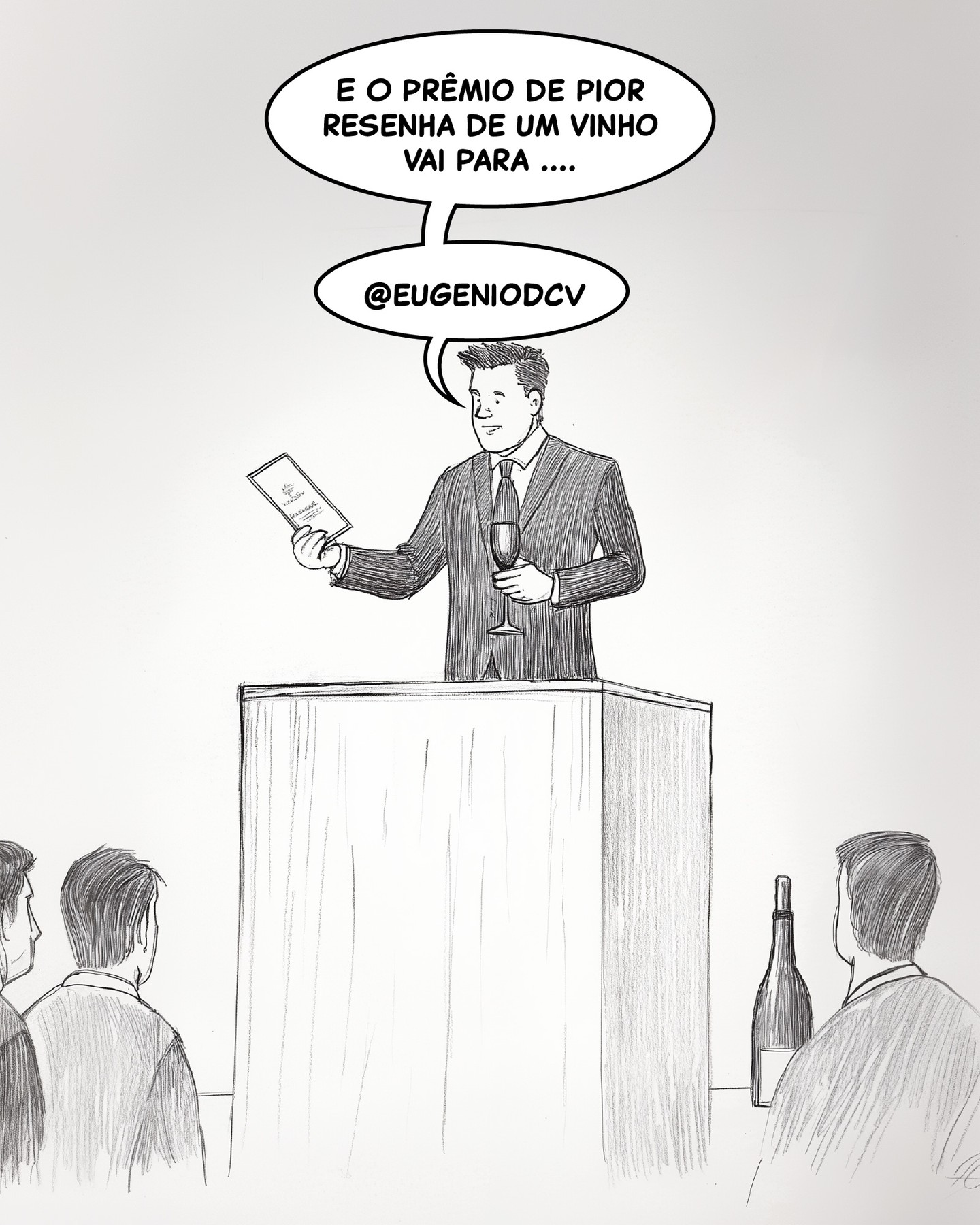 Imagem 1 (Cartoon): Um apresentador em um púlpito, segurando uma folha de papel e uma taça de vinho, anuncia para a plateia: "E O PRÊMIO DE PIOR RESENHA DE UM VINHO VAI PARA .... @EUGENIODCV"