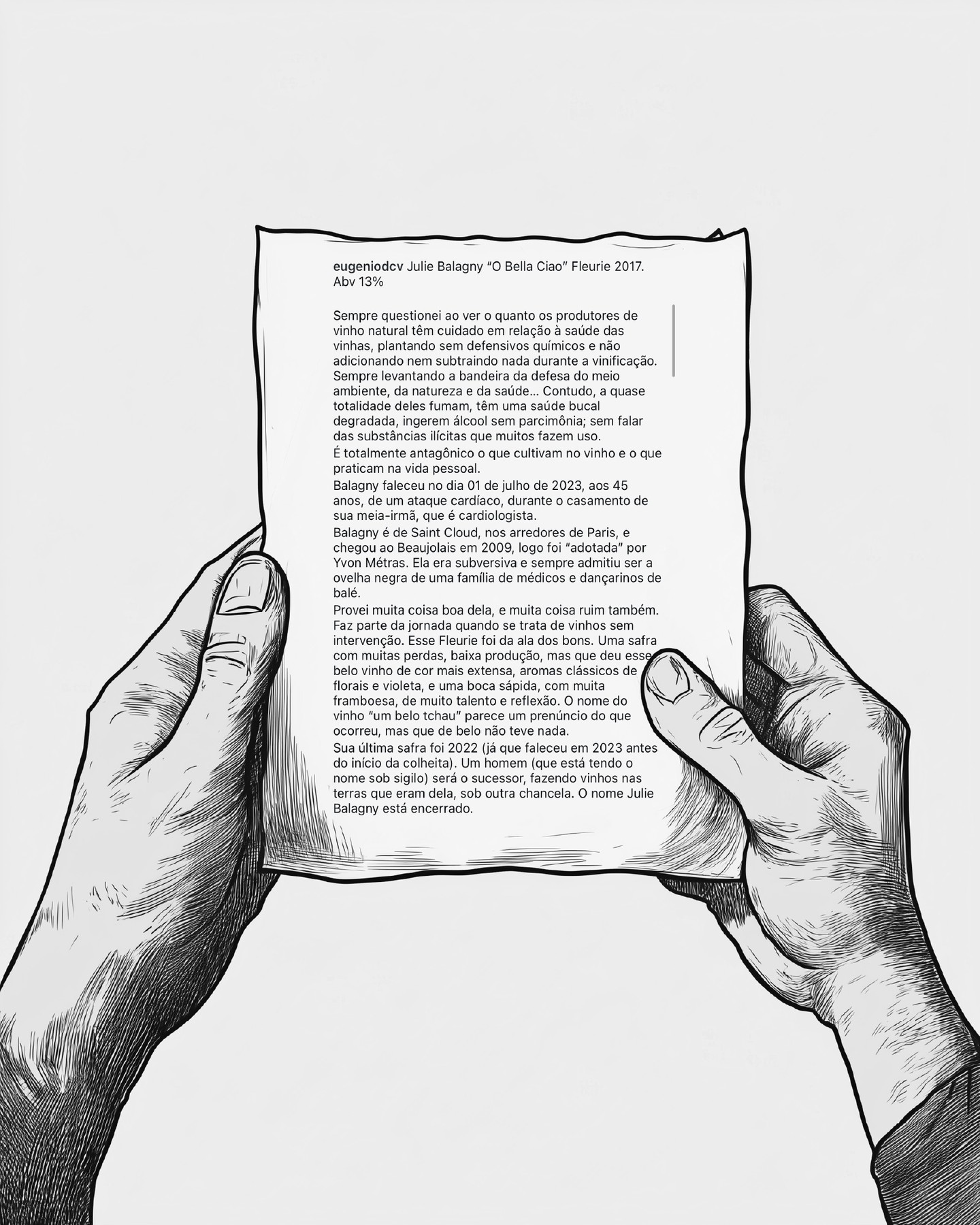 O post critica uma resenha feita pelo usuário @eugeniodcv sobre um vinho da produtora Julie Balagny, que faleceu precocemente aos 45 anos em julho de 2023, vítima de um ataque cardíaco durante o casamento de sua irmã. A crítica se deve ao tom da resenha, que começa julgando a vida pessoal, saúde e hábitos dos produtores de vinho natural ("fumam", "saúde bucal degradada", "substâncias ilícitas") de forma desrespeitosa e moralista. A indignação da comunidade (representada pelo prêmio de "pior resenha") surge do fato de o autor usar esses julgamentos estigmatizantes justamente ao comentar sobre uma produtora falecida tragicamente, sugerindo uma relação causal insensível entre o estilo de vida "natural" e sua morte.